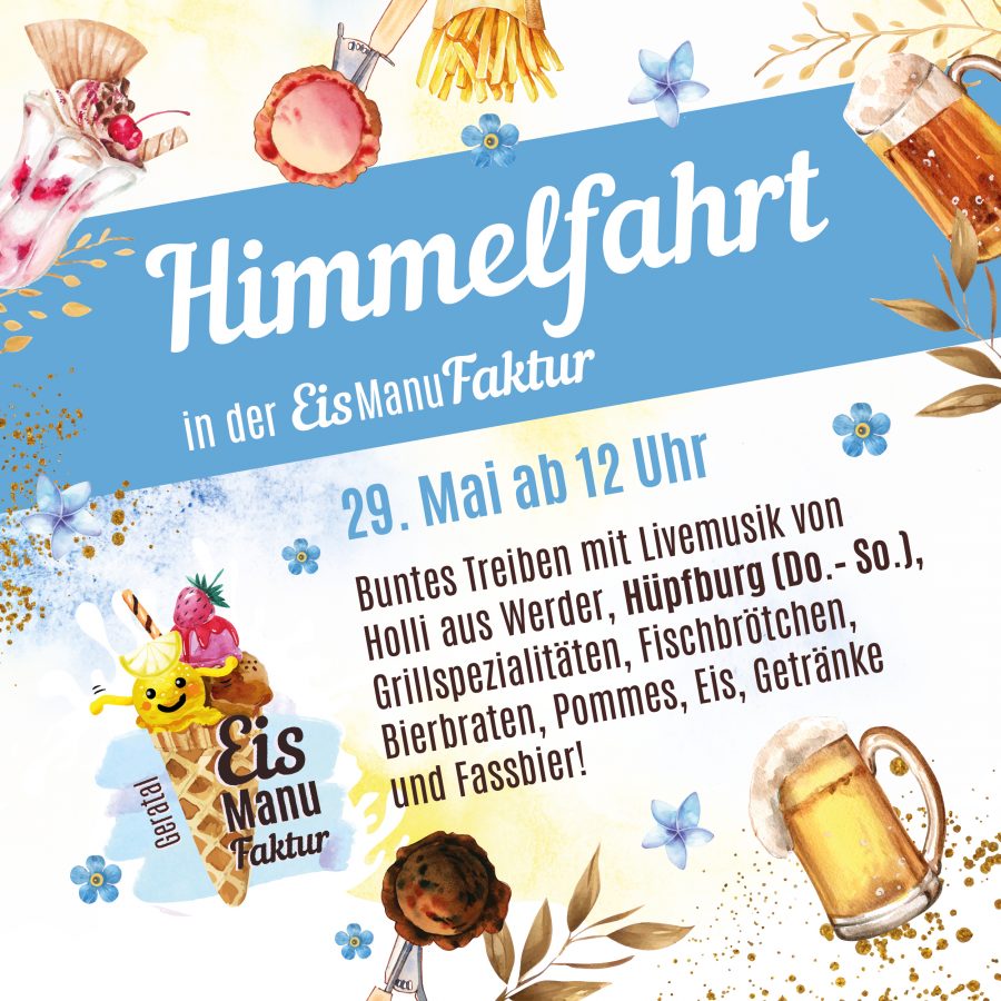 Liebe Gäste, Himmelfahrt steht vor der Tür – und das möchten wir wieder gemeinsam mit euch feiern! Am Donnerstag, den 29. Mai, ab 12 Uhr erwartet euch ein buntes Treiben an und in der EisManuFaktur in Gräfenroda – mit Musik von Holli aus Werder, guter Stimmung sowie leckeren Speisen und Getränken. Freut euch auf: Grillspezialitäten…